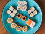 10 uramaki de salmão grelhado e 10 niguiri de kani